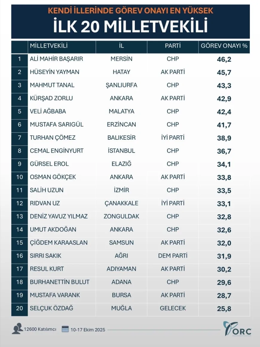 Ankette, Mersin Milletvekili Ali Mahir Başarır yüzde 46,2 ile ilk sırada yer alırken, Hatay Milletvekili Hüseyin Yayman ve Şanlıurfa Milletvekili Mahmut Tanal ilk üçteki diğer isimler oldu.