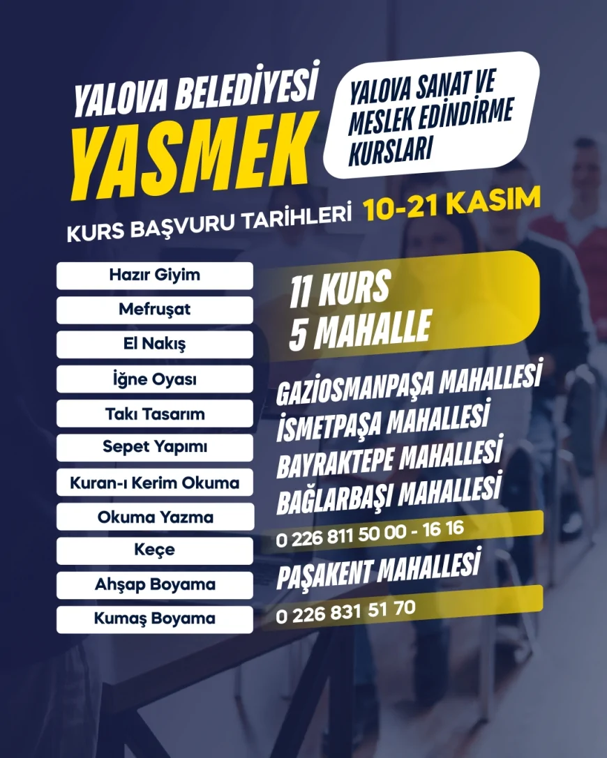 Yalova Belediyesi, kent genelinde istihdama ve sosyal yaşama katkı sağlayan YASMEK (Yalova Sanat ve Meslek Edindirme Kursları) için yeni dönem kayıtlarını başlattı. Başvurular, 10-21 Kasım 2025 tarihleri arasında yapılacak.